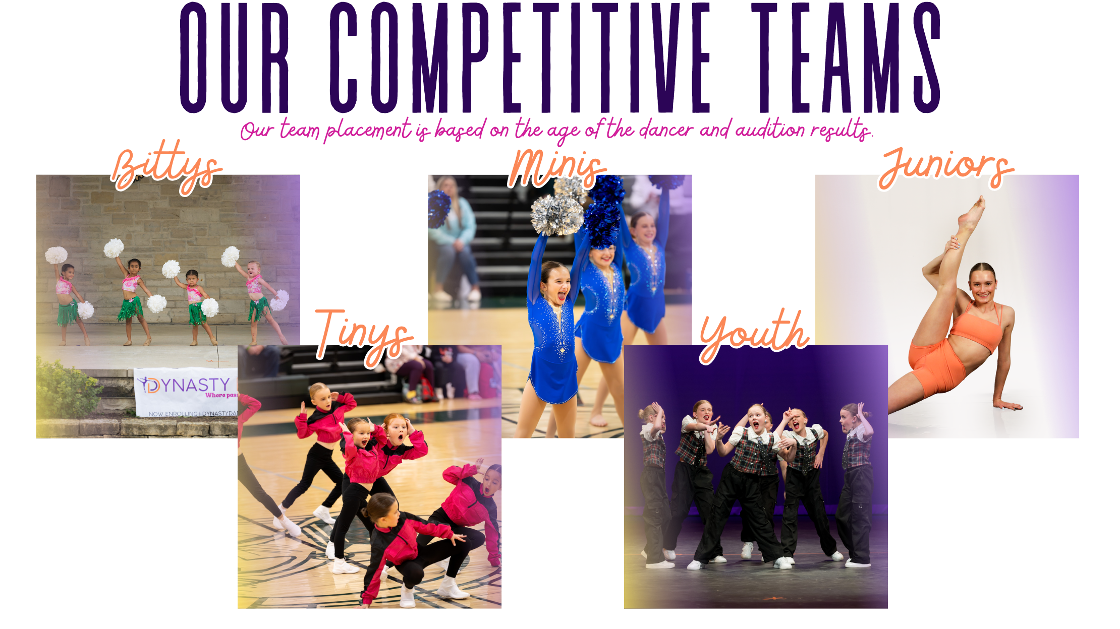 WELCOME TO DYNASTY DANCE COMPETITIVE TEAMS - WHERE PASSION MEETS PRECISION, AND TALENT TRANSFORMS INTO ARTISTRY. OUR PROGRAM IS DESIGNED TO CHALLENGE AND INSPIRE DANCERS WHO ARE READY TO TAKE THEIR TECHNIQUE TO THE NEXT LEVEL. WE BELIEVE IN STRIKING A DYNAMIC BALANCE BETWEEN THE THRILL OF COMPETITION AND THE PURE JOY OF PERFORMANCE. AT DYNASTY, WE PROVIDE AMPLE OPPORTUNITIES FOR ATHLETES TO SHARE THEIR LOVE OF DANCE THROUGH LOCAL EVENTS, FOSTERING A SENSE OF CONNECTION AND GIVING BACK TO THE COMMUNITY.
